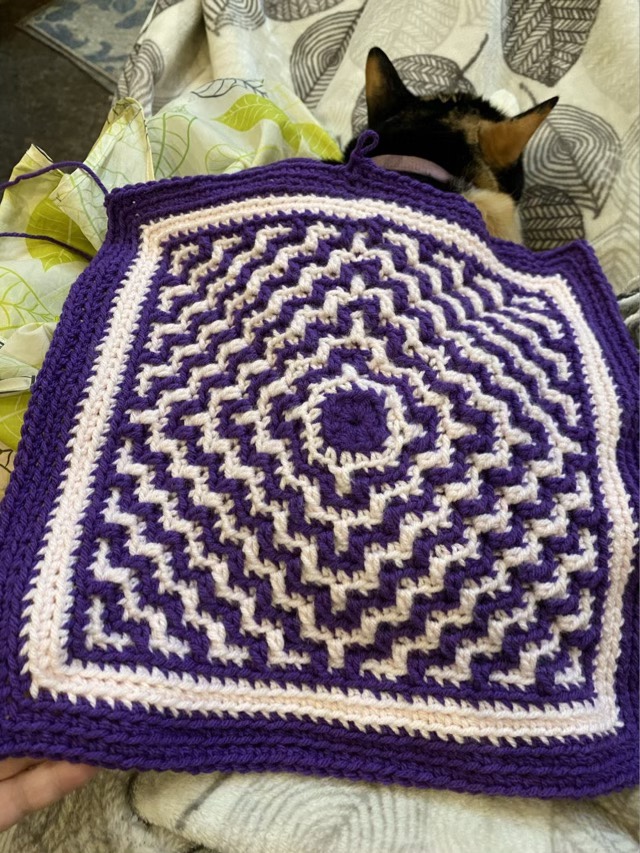 Photo description: Mosaic crochet square in purple and light pink with diagonal wavy lines and a wide border covering a sleeping Calico cat.