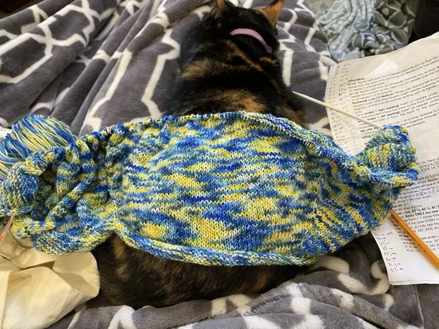 I picked up my knitting again and progressed a little farther. I keep telling myself that this is the worst bit, row-length-wise. I’m making a top-down cartigan with raglan sleeves, and across the shoulders, before the arms are separated from the body, the row has around 300 stitches and is increasing. I’m close to separating the sleeves and then I hope the work will at least perceive to go faster. I posted a couple shorts on YouTube of my real-time perl and knit. It is slow going.