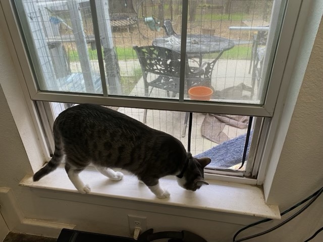 When we built the catio almost six years ago, we set up a window as the access point. To keep the flies out I cut a cat flap in the screen (because window screens are relatively easy to fix). Well, this is fantastic in the summer, but in the winter it gets a bit chilly in the living room. I had been using a scrap piece of clear plastic to block some of the incoming draft, but it was getting old and brittle so I ordered a larger piece. With a larger piece I was able to cover the whole screen and cut a new cat flap.