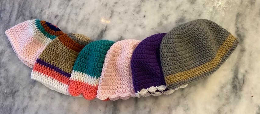 I have worked my way through the entire bag of acrylic scrap yarn. Here is the lineup of hats I was able to put together with the multitude of colors.