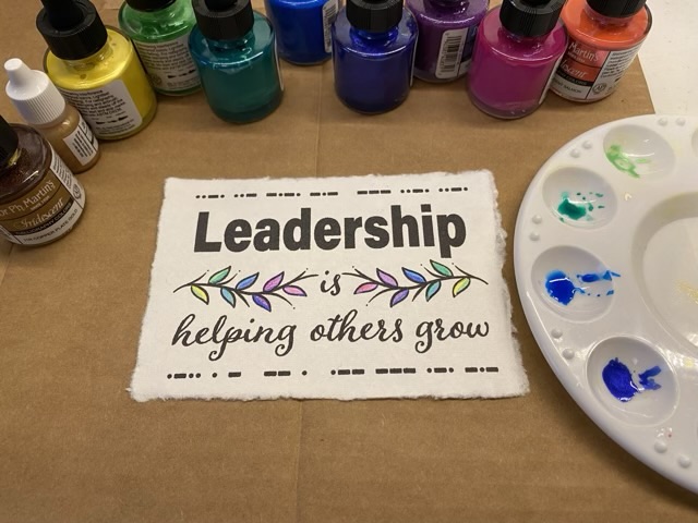 I was commissioned to do a desktop inspirational piece on leadership recently. The parameters required fancy paper and something subtly rebellious. I found deckle edge recycled cotton paper, and did a design in Adobe Illustrator that says “Leadership is helping others grow” with custom mirrored leafy vines. The dot and dash borders are actually morse code and the bottom line says “let me work”. The top line uses more colorful language.