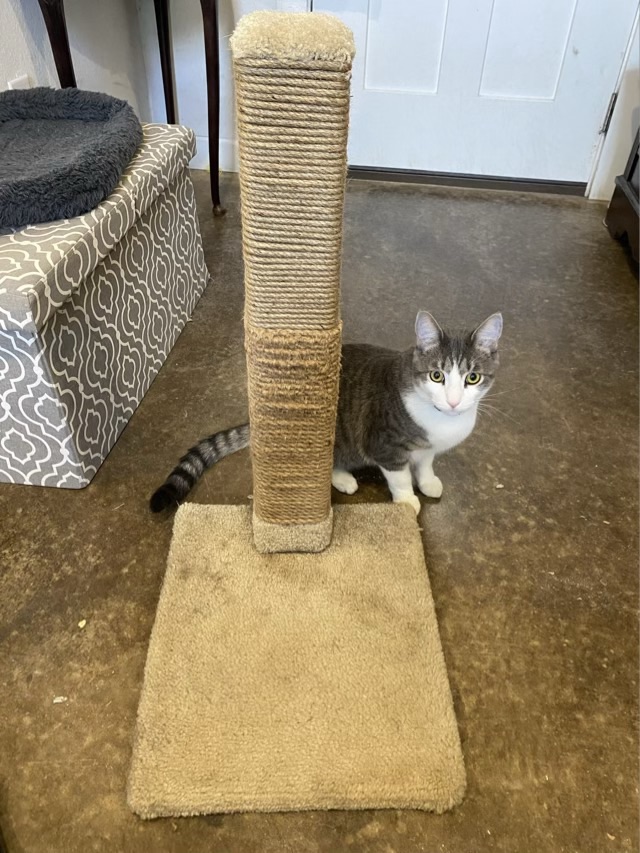 Photo description: carpet and rope cat scratcher post with new rope on the upper half of the post. Gray tabby looking like he is about to start something standing behind the post.