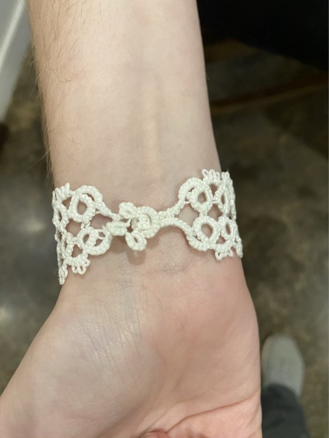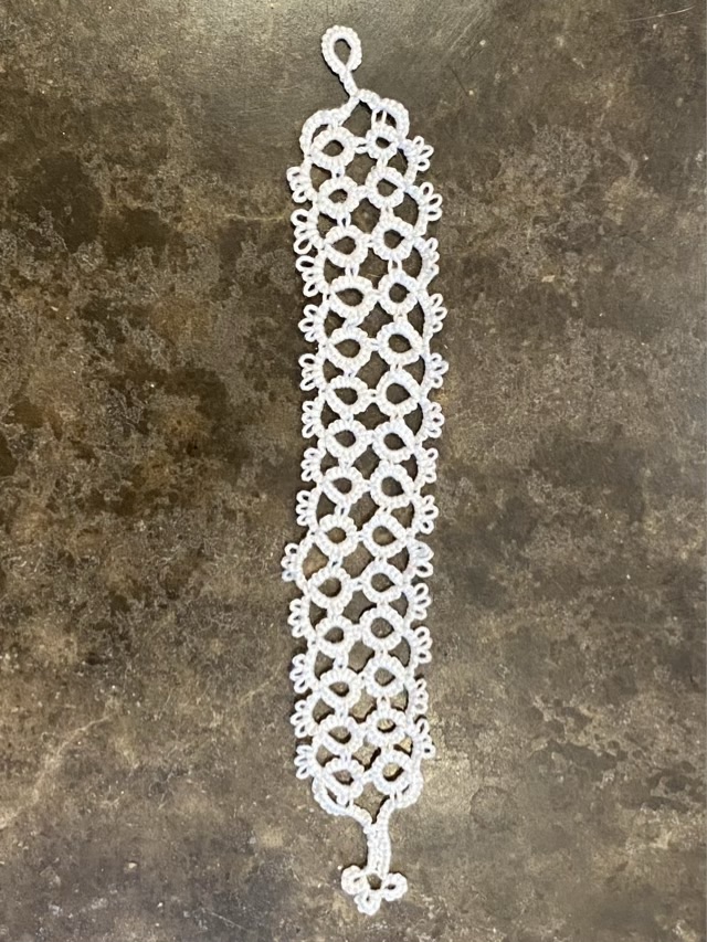 I saw a picture on Pinterest of a tatted bracelet that I recognized most of the elements used for construction. I’m having trouble interpreting written tatting instructions, but a picture is almost as good as a chart, and much easier for me to follow. I loaded up my tatting shuttle with #10 cotton, left it attached to the ball, and started with the ring part of the clasp. It took me a few hours to complete, and I carried it around in my purse for a while to work on when I was waiting. The bracelet is worked with the same series of a closed loop and a chain on both sides, and each connection used a picot.