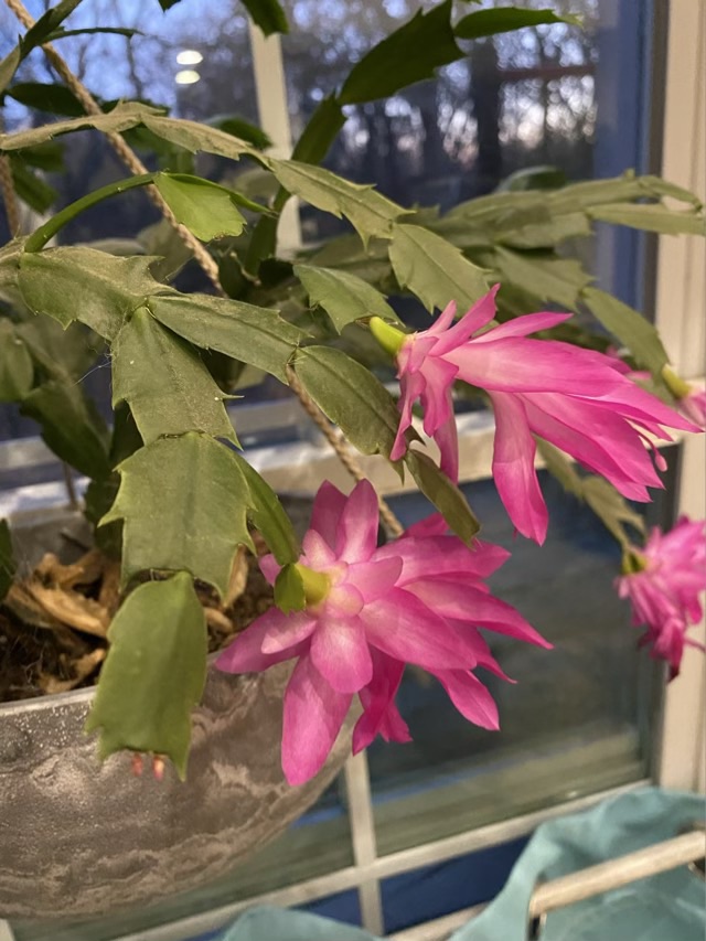 Did you know that there are Thanksgiving cactus and Christmas cactus? I did not until a reader kindly sent me a link. I thought I had a Christmas cactus (Schlumbergera bridgesii) blooming for the last few years in my house, but it is actually a close relative, the Thanksgiving cactus (Schlumbergera truncata). The easiest way to tell, for me, is the spikes on the edge of the leaves, characteristic of trucata, where bridgesii has rounded edges on the leaves. Care for both is the same, but truncata is a sturdier plant, which is good in my house. I did go back and update my previous posts with the correct information. I post often on this cactus, apparently!