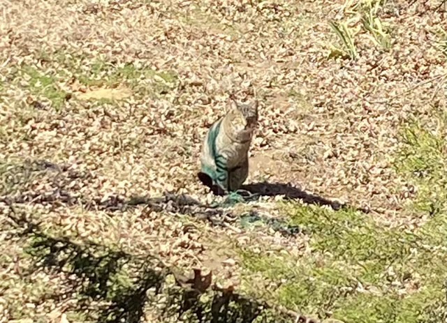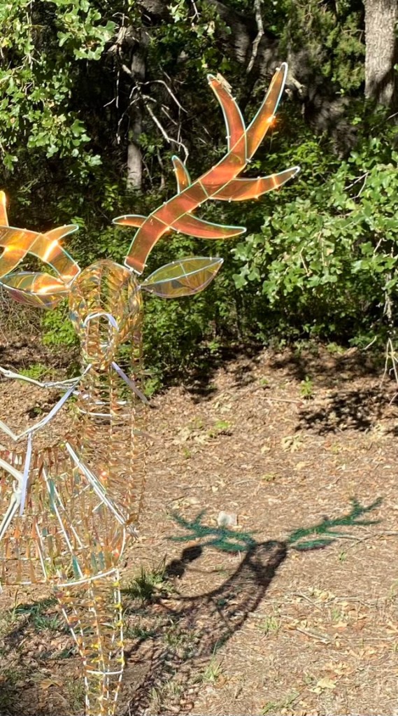 I was out brushing Mr Tom the long-haired white cat, when I looked up to see his colony mate, who we call Garfield’s brother, with some very unusual coloring. I thought maybe he somehow tipped a dye pot somewhere, but no, he was sitting in the shadow of my wire deer. The iridescent plastic in the deer’s antlers cast a teal-colored shadow.