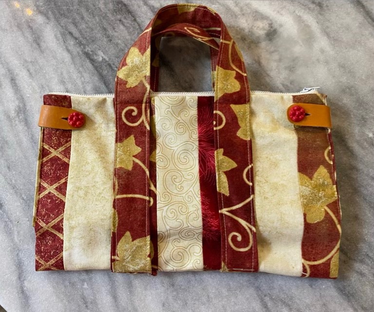 I used the treadle machine to sew two long strips of fabric together, turned it right-side out, stitched along the edges, then sewed it into a circle to make the handles. I machine sewed the handle to the bottom of the bag, then hand sewed the handle to the top of the bag. To keep the bag closed, I cut some thin pieces of finished leather, cut in button holes, and sewed them to the sides of the bag. I found vintage red buttons in my button stash and hand sewed them on.