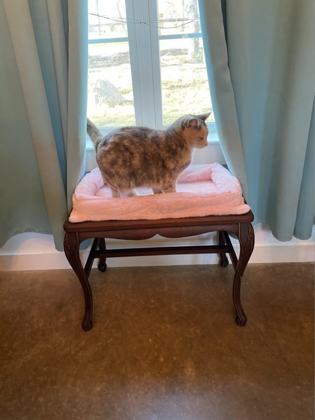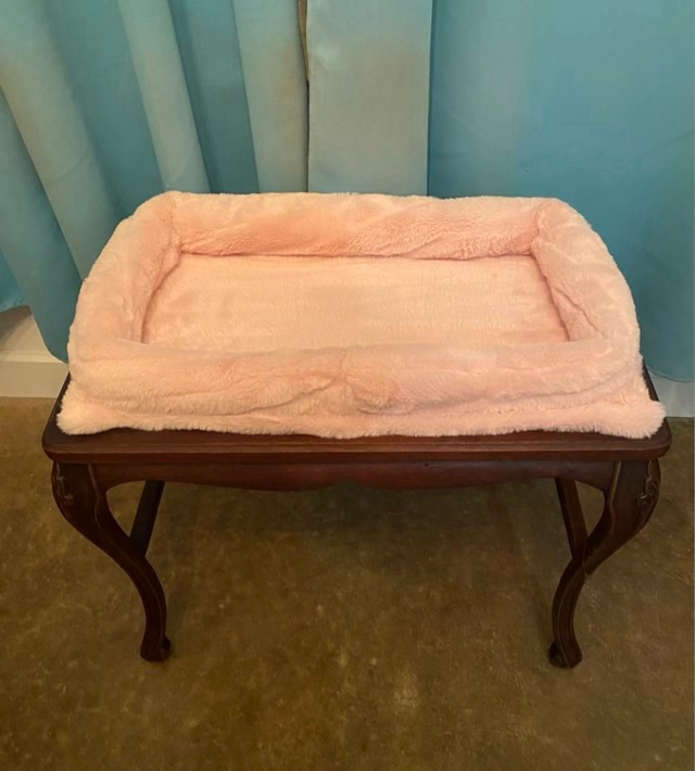 I had a pink fuzzy blanket that had already been cut into for another project (we couldn’t find the fabric by the yard, so bought a blanket), and sewed a two sided mat. I stapled the mat down to the table top, over the central opening. I then sewed a long tube of the fabric, stuffed it with polyfil and sewed that down on the mat. It is quite the sight. The cats are not too sure of it, so I put it beneath the front window where it will get some sunlight. I’ve sequentially put all three cats on the bed; all have rejected it. I’ll give it some time.