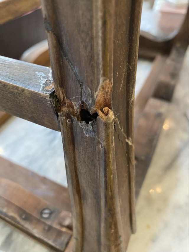 I bought some Apoxy sculpt modeling compound, which is a two-part epoxy clay that hardens without baking. I bought the color called “bronze” because I was inspired by the Japanese method of Kintsugi, or making a visible gold repair. The “bronze” was not metallic at all and actually was a fair match to the stained wood. Huh.