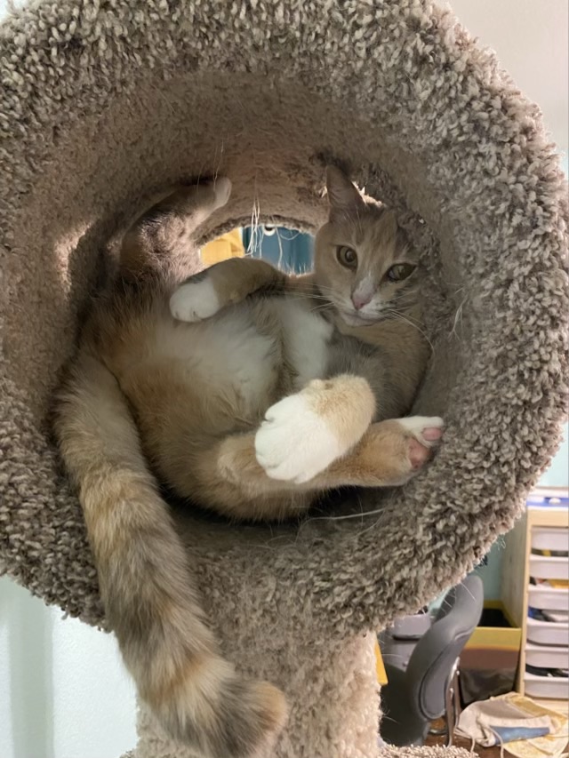 Sophie the cat loves to climb her carpeted cat tree and play “get your fingers” through the holes. She is willing to contort for the side attack. Silly cat.