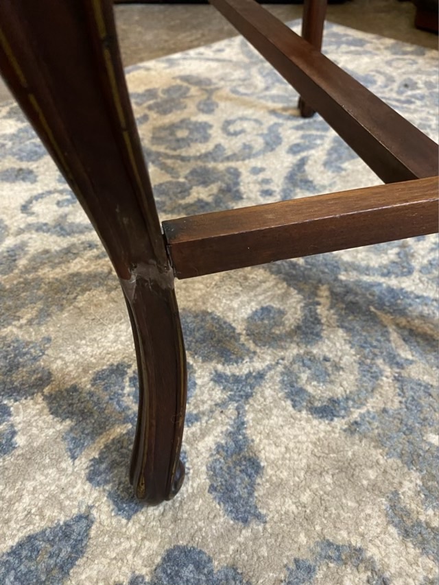 One of my neighbors put out an upholstered stool on the side of the road. It had elegant curved legs, but one of them was broken. I picked it up and glued the leg back on.