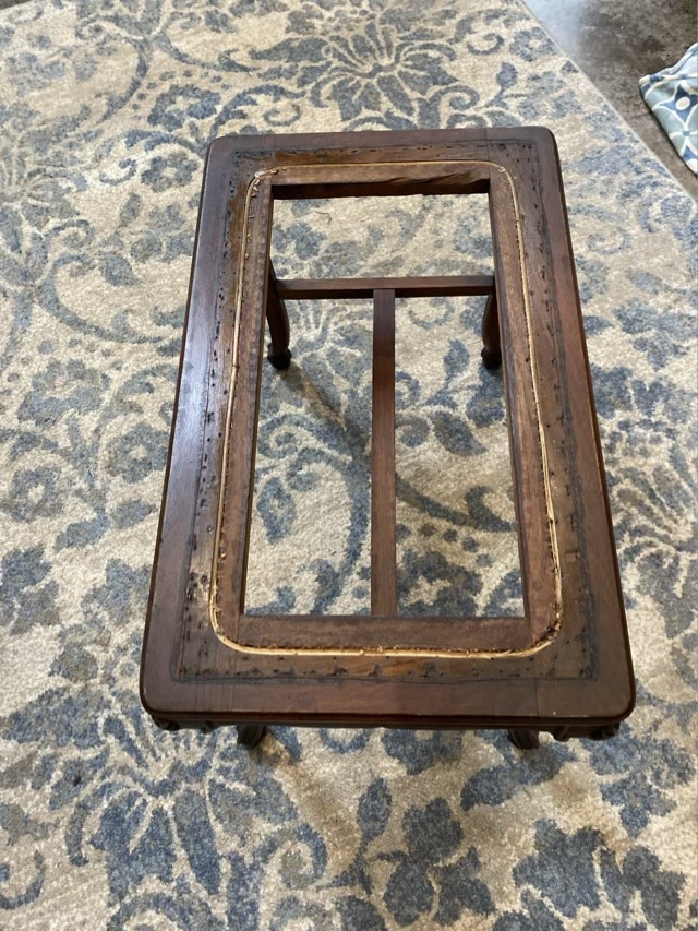 This little piece of furniture has been many things. At one point it had a rattan top that had been cut out. I’m guessing the rattan was original and this was intended to be a side table. Then there is a round of staple or tack marks around the old rattan groove, which I assume was the second and maybe even third life of the piece. When I picked it up, it had green velvet fabric stapled to a plywood board, that was then screwed in place from underneath.