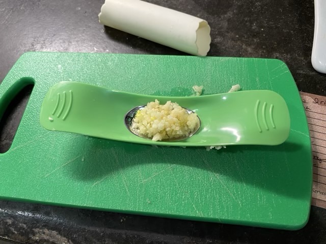 This garlic press came with my youngest’s latest Raddish Kids crate, and I’m quite impressed. It is a simple design, easy to use and easy to clean. The white silicone tube in the back of the picture came with a garlic plate I ordered years ago. It is my favorite way to crack garlic: put a clove of garlic in the sleeve, roll the sleeve under the palm of your hand, presto deskinned garlic.