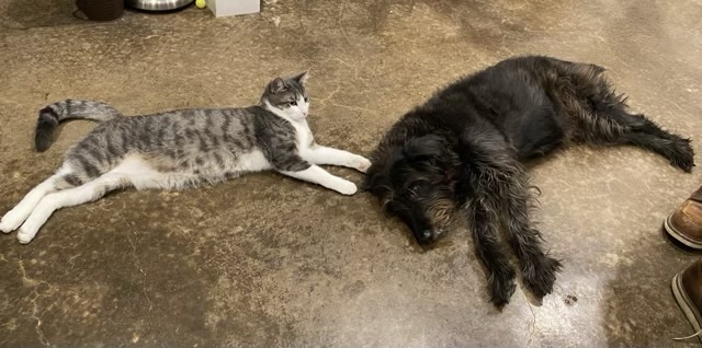 This is a picture of a 15 pound cat and a 50 pound dog. Angles and perspective make it look like the cat is nearly the same size as the dog. Thor the cat is a big boy, but not that big. Griffin the dog is being quite tolerant of the cat. Thor is just now a year old; Griffin is ten, approaching eleven.