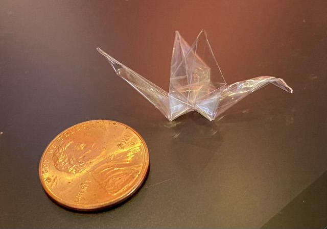 Many years ago I learned how to fold paper cranes. It is my go-to fidget when I’m waiting and there is paper available, mostly a situation I encounter in restaurants. My cranes have become smaller and smaller as my kids grew and the paper available diminished. I went from coloring sheets to sugar packets. My favorite so far has been a minuscule crane folded out of clear plastic.
