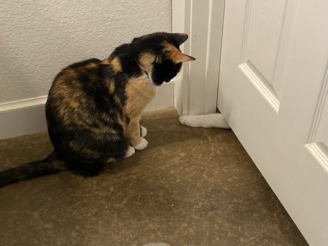 Thor the cat plays a dangerous game, sticking his paws under doors at Izzy the calico. His favorite thing to do is antagonize her, and she doesn’t mess around. She goes for the take down. Right after this picture she went after him, both paws and mouth open. Maybe they are playing? If so, she doesn’t play nice.