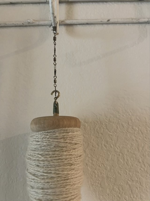 A couple weekends ago I spent about five hours doing spinning demonstrations at a local Earth Day market. I was spinning Shetland wool on a spindle that I have demonstrated on before, so only about half the yarn cop was spun that day, but it was enough to fill the spindle. I found that hanging the spindle from my canopy made it easier to off load the yarn. So at home I tried the same thing, but used fishing swivels instead of a loop of yarn, which works much better. Did I take pictures of the full spindle with single spun yarn? Or the nice nostepinne style center pull ball of yarn? No, much to my later self’s dismay. I did the photo record of the two ply yarn, and the resulting skein after blocking.
