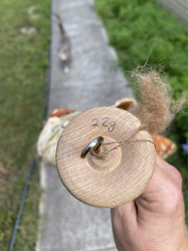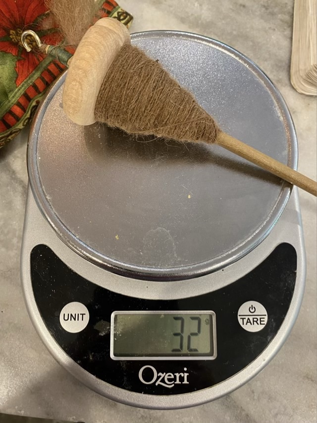 I wrote down the tare weight of my spindle so I could track the amount of yarn I’m building up.