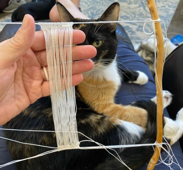 Photo description: starting to weave sprang, I was warned that sprang holds special fascination for cats, and Izzy the cat was quite enthralled with the many stringsPhoto description: sprang in progress with the loom on the floor and several rows completed