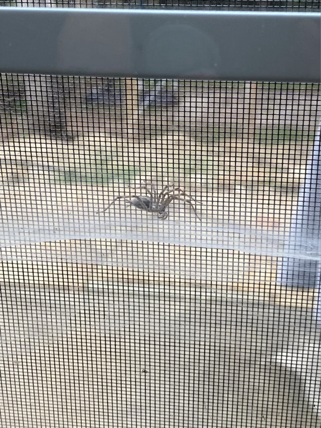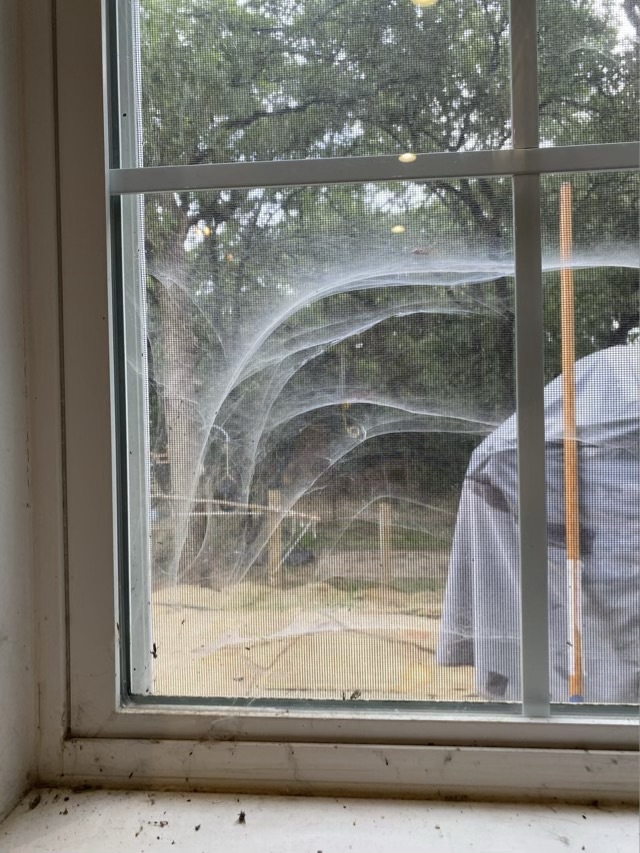 Photo description: grass spider tunnel webs in the window, house spider webs in the inside cornerPhoto description: the grass spider architect