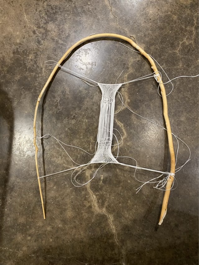 I’ve been wanting to attempt making sprang fabric for awhile now. I even made a small sprang loom from a trimmed elm branch. Sprang is a type of weaving where all the threads are warp threads (vertical), with no weft (horizontal). The threads are twisted around each other and the fabric is worked from the top or bottom simultaneously (what is done with threads at the top happens in opposite to the threads at the bottom). AI tells me that sprang dates back to the bronze age, although it seems like the summary was gleaned from Wikipedia, which at least gives me a list of references that confirm this art is ancient.