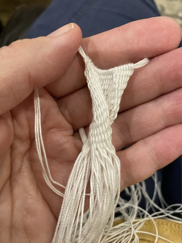 I had some #10 crochet cotton next to my chair (crochet is probably my youngest craft), so decided to use that after watching a video from Sally Pointer, who is an accomplished heritage educator.