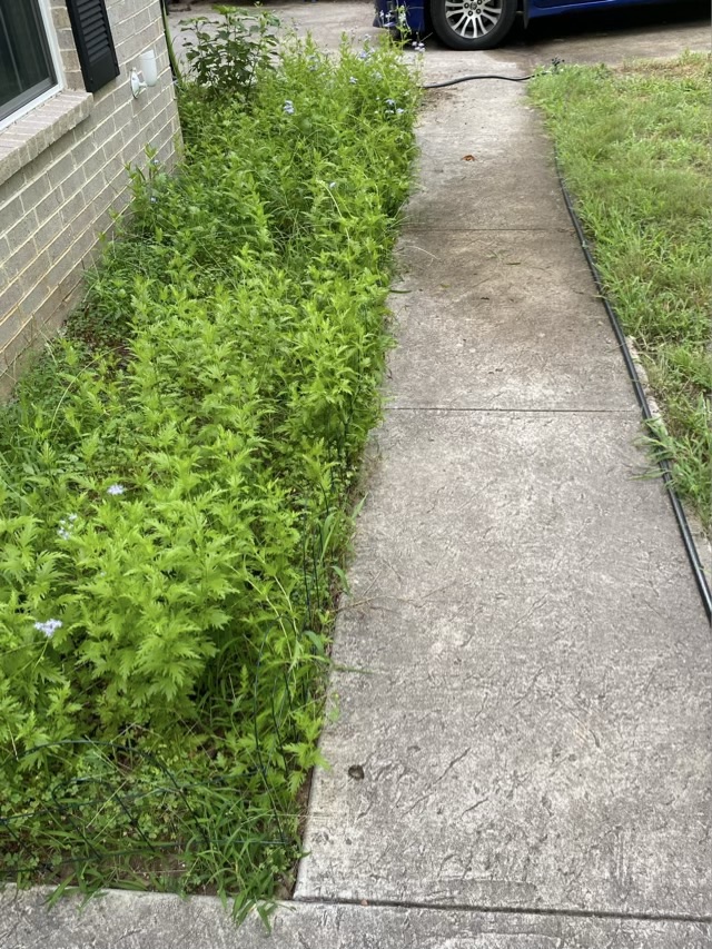 Photo description: Sidewalk clear and Gregg’s mist flower containedPhoto description: Gregg’s mist flower and oxalis (and some stubborn grass) behind an almost invisible wire fence