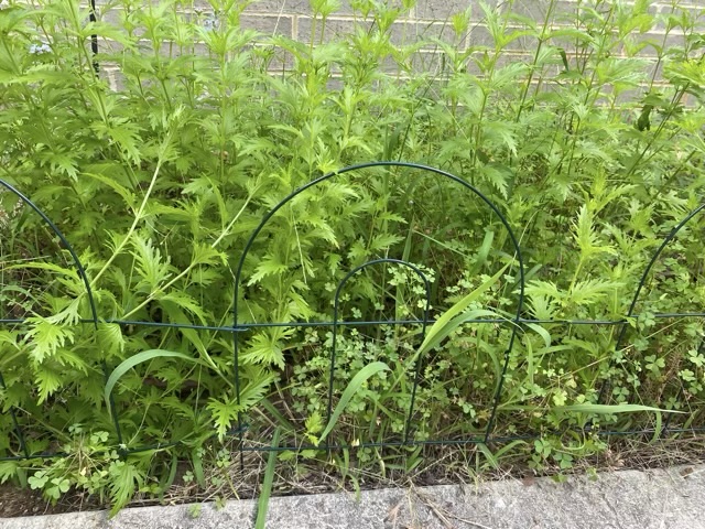 I didn’t want to trim the plants back because the healthiest growth was near the sidewalk, so I found some green wire push-in fence and installed it along the sidewalk. What a difference!