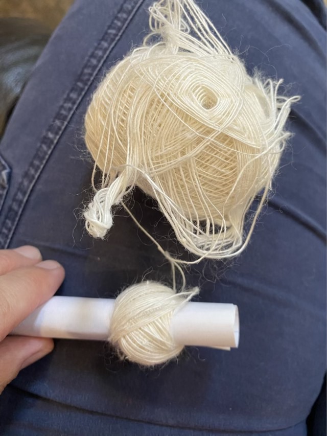 I finished plying and my Turkish spindle wrapping technique is improving. Since I’m going to work directly from the center of the yarn turtle for the next step, I don’t need to rewind. The Turkish spindle turtle does very well as a center pull ball.