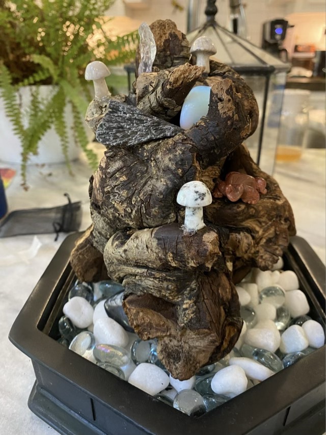 After boiling and baking my gnarled wood that I wanted to use in my terrarium, and washing the base and all the stones, I tried setting it up again. I visited a local vintage store and picked up some interesting stones, including tiny crystal mushrooms. Mushrooms!