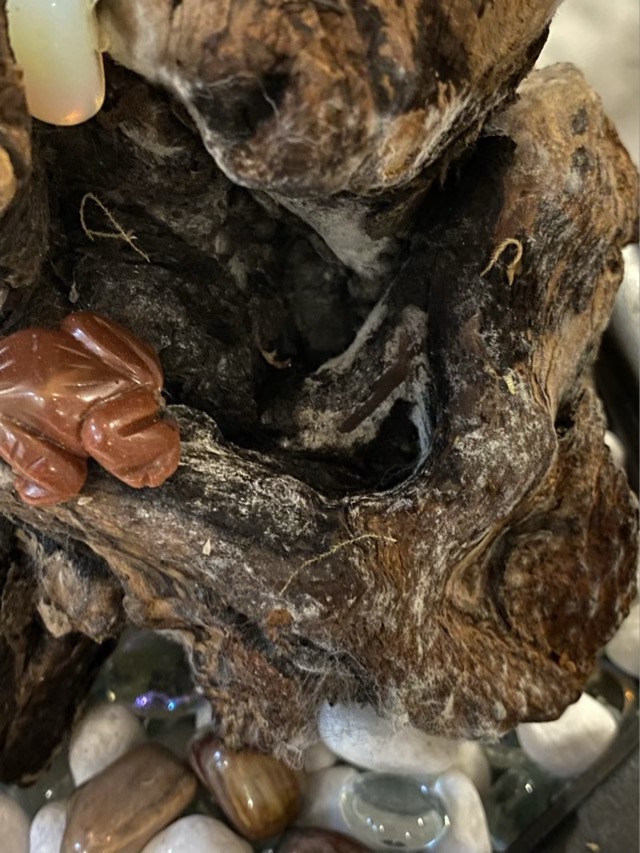 I kept the moisture to a minimum, setting the base with dry decorative rocks and glass pebbles, and using glue dots to adhere the carvings and stones. The only moisture came from the sphagnum moss that I tucked into the two hollows in the wood where I wanted to keep plants. I even braved the shipping and ordered a jewel orchid (I used points, so am not counting the cost of that towards the project). I let the moss sit for a few days to test for mold growth. My orchid arrived earlier than expected, and when I went to mount it, I discovered mold in the hollows. Dang it.