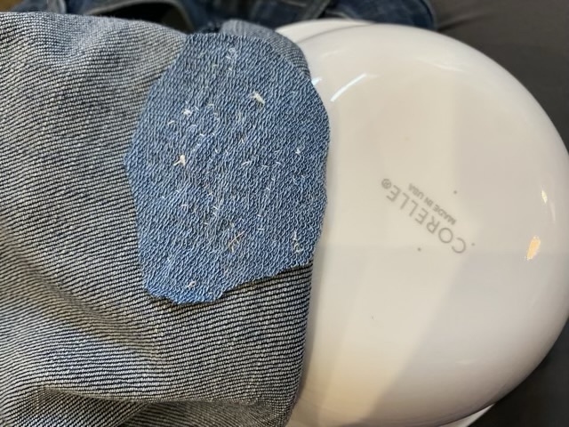 I’ve been collecting visible mending pins on Pinterest, so when my eldest tore her jeans, I sent her to my Pinterest board to pick a pin.