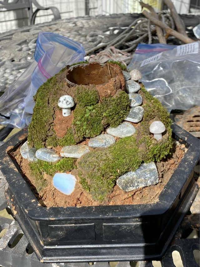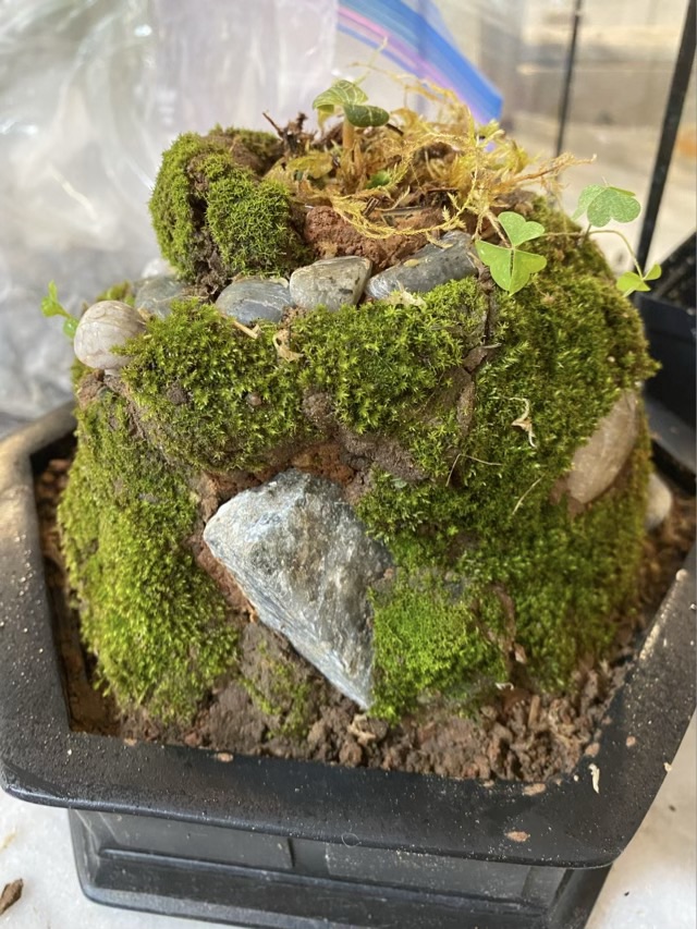 I really enjoyed this build. The clay soil was easy to work with because we have had a very wet spring, and the moss molded well against the clay. I made a spiral staircase because I like spirals. I filled the center tube with sphagnum moss and put the jewel orchid at the top. I found small plants in the yard in the shade that I tucked between sheets of moss as well.