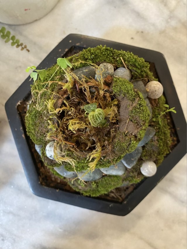 I cleaned and washed the terrarium a third time. When rebuilding this round, the chunk of wood that kept sprouting mold was not included in the build. Instead I turned to our backyard, which is mostly clay and marvelous to sculpt. I put a layer of glass pebbles down in the base, added some activated charcoal, then put down a compacted layer of dried sphagnum moss. I used the top part of a champagne flute (the bottom broke off rather jagged, but it went down into the moss, so no danger of cuts) as a form, basically a glass tube in the middle that would be a “pot” for my jewel orchid to ensure it had room to grow and didn’t get soaked, as I tend to overwater.