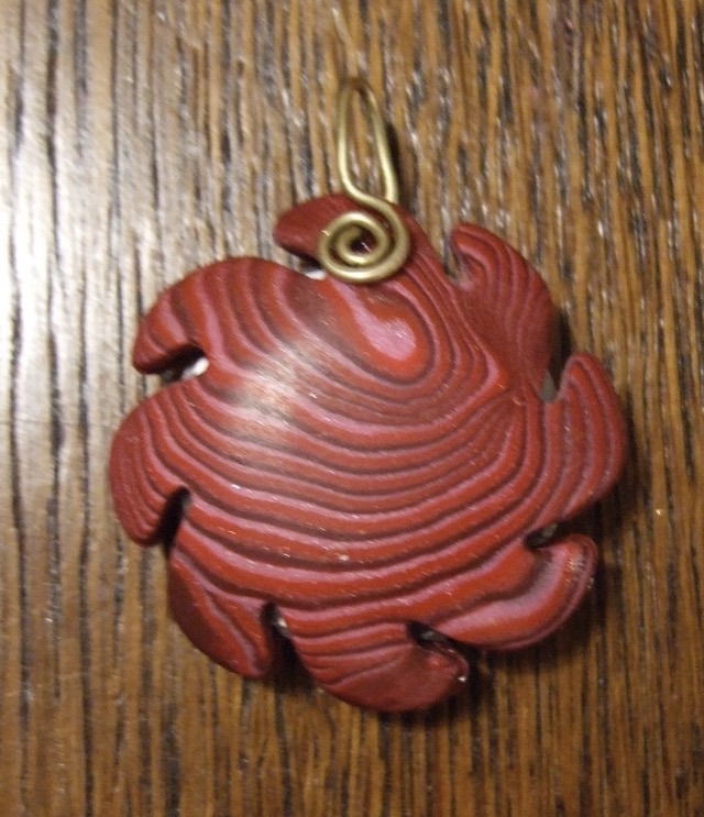 I had a long period of time in which Sculpey clay was my go-to medium. I found this photo from March 2007 of a thread cutter made from layered oven bake clay surrounding a wheel cutter blade with a brass wire loop. I formed each side of the cutter using a mold that I made, baked it, sanded it, then assembled it, probably with glue (tsk). The loop was properly made with a mechanical connection: prongs that went into holes in the clay.