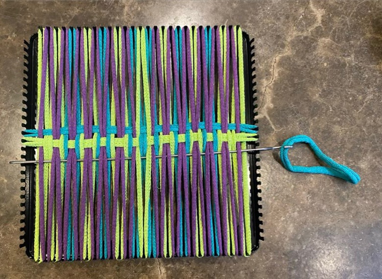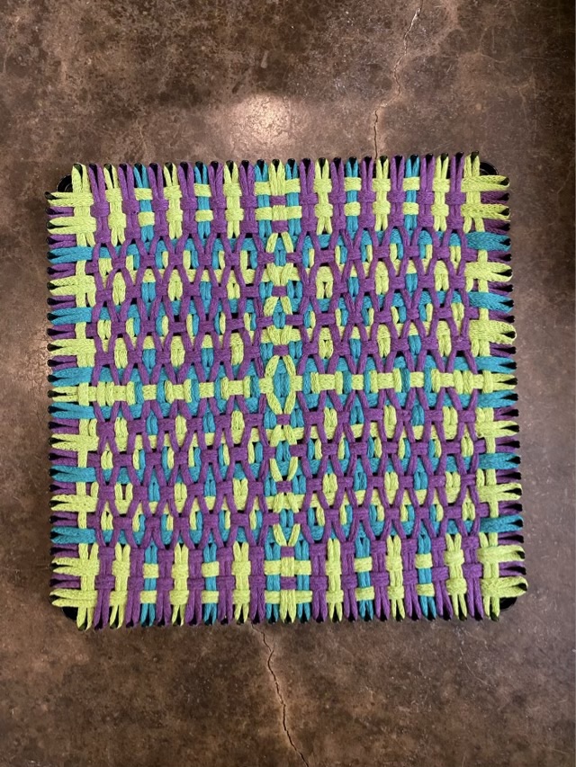 So now that I’ve pinned a couple potholder pictures on Pinterest, my feed is flooded with pin looms covered in cotton loops. I saw a partially woven potholder that had adjacent loops twisted over each other. There were no instructions or guidance, so it took me a bit of experimentation, and I didn’t make an exact replica, but I did enjoy working on a new technique.