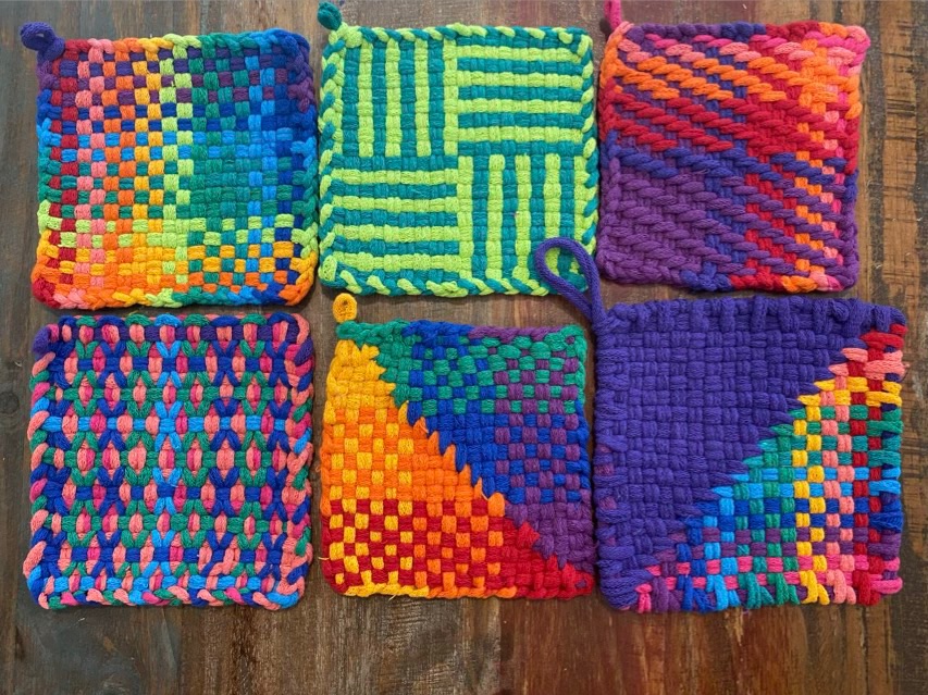 Photo description: purple, red, orange, and pink loops on a potholder loom with a third of the twill weaving pattern started and the weaving hook inserted for the next passPhoto description: twill potholder finished with a chain stitchPhoto description: six potholders made from one Harrisville Designs kit. From top left to right: plain weave with rainbow order chain finished, light green and dark green plain weave with alternating colors chain finished, twill pattern chain finished, twisted warm and cool colors three sides chain finished, warm colors vs cool colors with 90 degree wraps chain finished, and purple vs rainbow 90 degree wraps loop threaded finish.