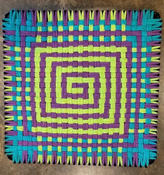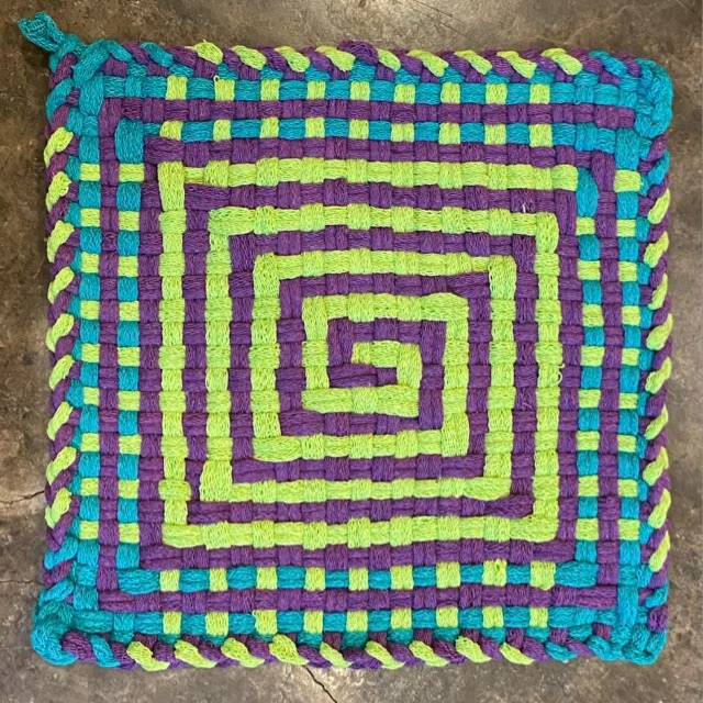 Once again I was down to the last set of cotton loops for a potholder loom. I actually started several patterns gleaned from Pinterest, didn’t like them, and took them apart. Once woven, the knitted cotton loops are quite robust, but if woven and unwoven repeatedly, they have a tendency to unravel. I needed to make a choice and stick to it. I love spirals so decided to tackle a spiral pattern potholder. This was easier decided than done. I did find a picture of a spiral potholder, but couldn’t wrap my head around the sequence of under overs working straight across. I ended up working from the center, slowly adding loops on each side and meticulously tracing the spiral, fixing the woven path as I went.