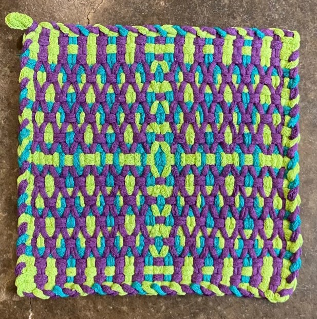 Photo description: weaving finished with the last four passes in plain weave on the top and bottomPhoto description: finished potholder with chained edge and corner loopPhoto description: opposite side of the same potholder