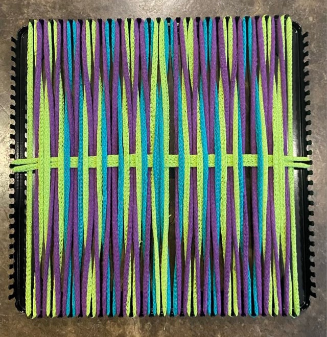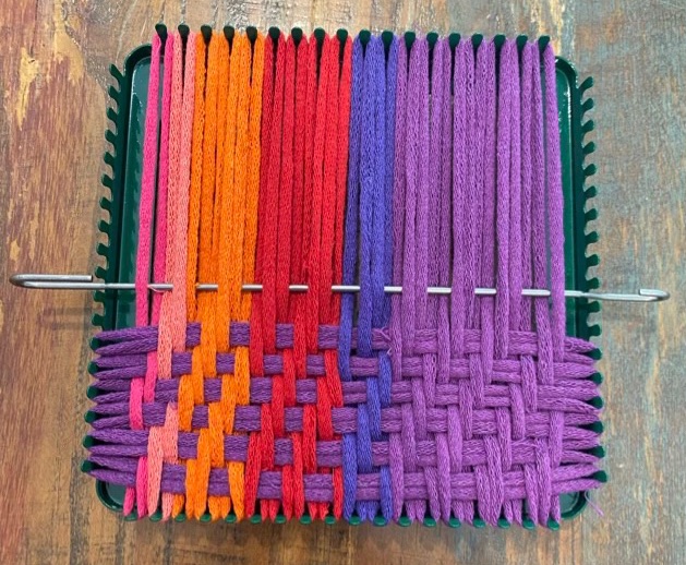 Photo description: potholder loom with loops hooked vertically across alternating warm (red and orange) and cool (dark blue, light blue, and green) colors. One green loop woven horizontally in the middle, skipping the first strand, the next two strands are twisted so the warm color is up, then strands 4 and 5 are twisted the opposite way so the warm color is up. The horizontal loop goes under the warm colors and over the cool colors twisted together across, with twist direction alternating.Photo description: two more horizontal strands added on either side of the center strand with no twisting, the warm color went under the cool colors on the first set of loops, and the cool horizontal color went under the warm colors, this set of loops are woven in the original pairs as with classic potholder loop weaving.