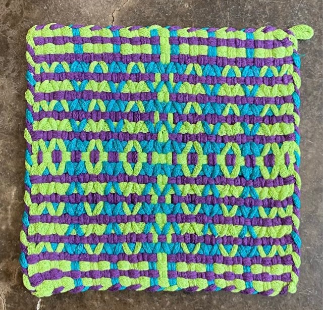 In the finished weave, the strands aren’t twisted, but rather curve back and forth vertically, which makes an interesting X pattern. As I write this post, I noticed a weaving mistake. Ah well. It is a potholder. I do find that if I leave a pattern for a bit and come back, I’m more likely to spot such errors. I was too eager to cast this one off.