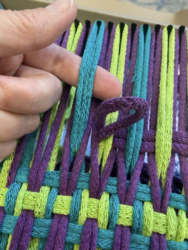 Photo description: weaving finished, shown still on the pin loom, mistake in bottom right
