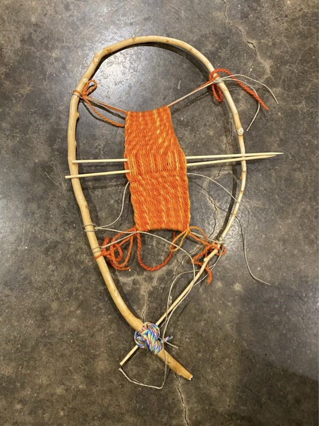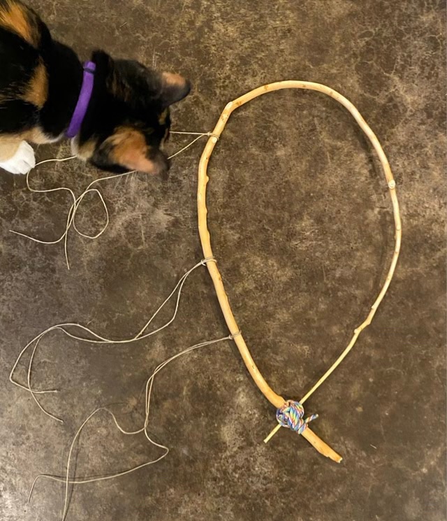 I’m determined to add Sprang to my crafting repertoire. This round, I secured the bottom of my small bent cane loom with some paracord so it was less loosey-goosey. I added life lines using hemp string, and used hemp for the header and footer ties. (Why hemp and paracord? That was what was next to me. The paracord is too thick for the lifelines (to me), so I replaced them with thinner hemp.)