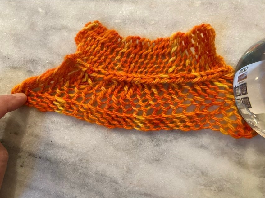 I went to finish the center with a crochet chain and everything went wonky. The chain crawled upward on the yarn, making the two uneven halves even more uneven.