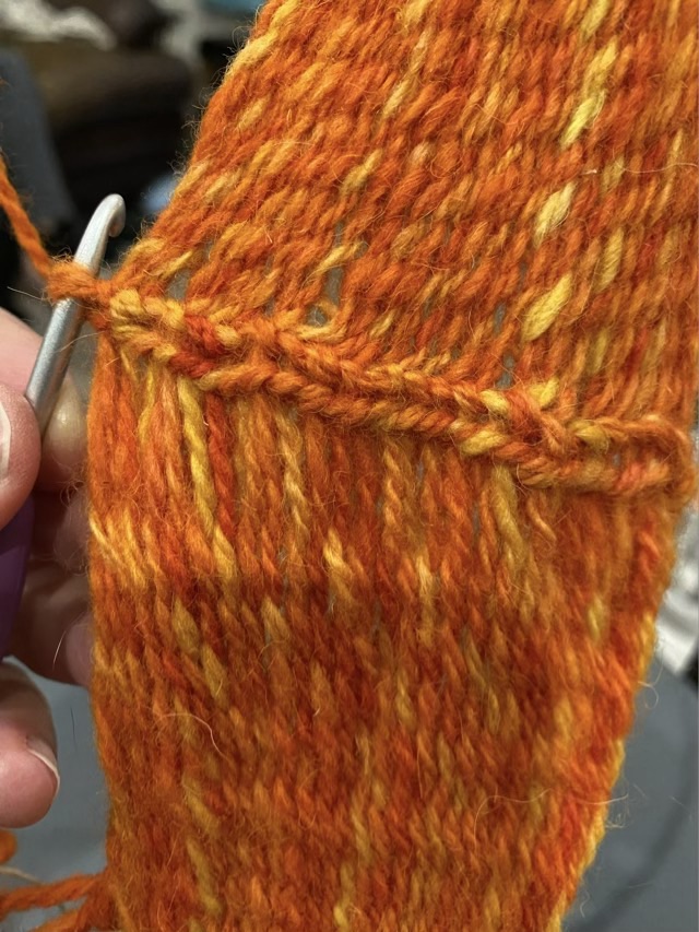 I wove in the ends, catching the live loop of the crochet chain when I went up the side, and blocked the piece by wetting and pinning it to dry.