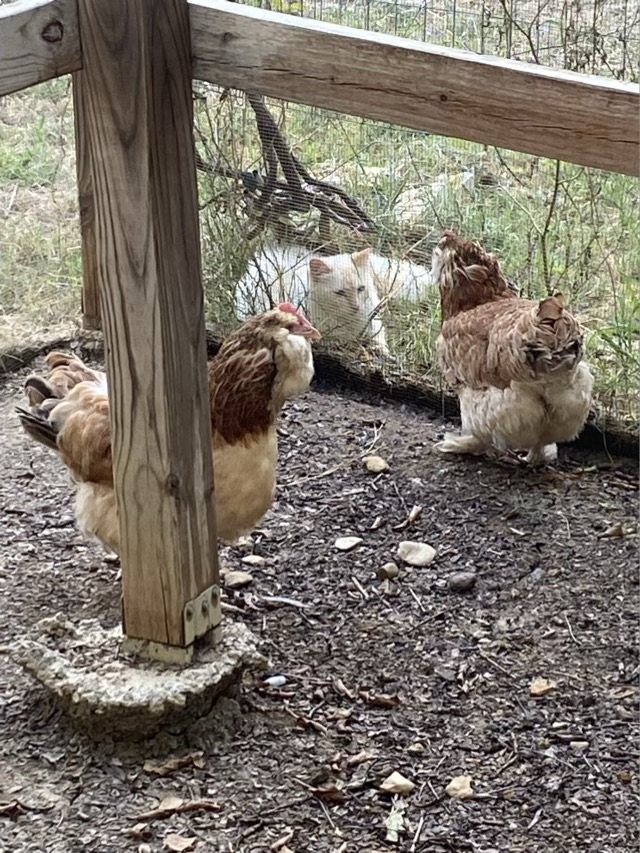 When it is hot, Mr Tom, my neighbor’s cat, likes to lay in wet patches of grass. I had just watered the crossvine outside the corner of the coop, and he took it as an invitation. Two hens went over to say hi and remind him to watch his manners. He was unconcerned.