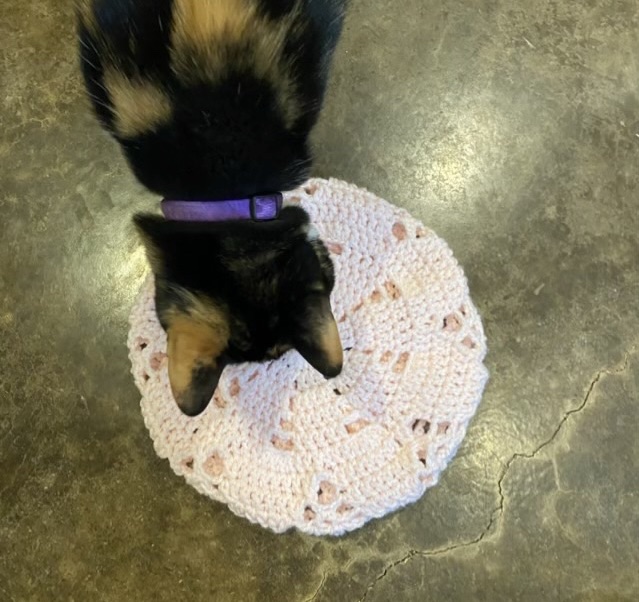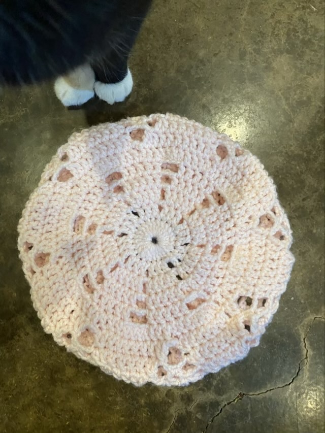 Photo description: light pink beret top with deliberate holes, sort of in a star pattern, cat feets for the photo bombPhoto description: brim side of the beret with single crochet ribbing