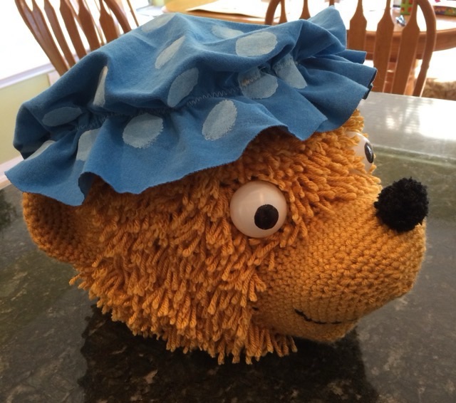 Photo description: crocheted bear head with latch hooked “fur”, half ping pong ball eyes, black pom pom nose, and blue mop hat sewn from an old t-shirt hand painted with polka dots