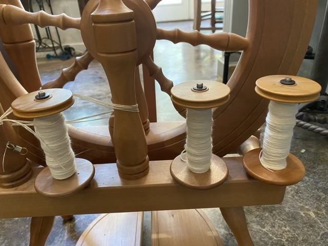I finished spinning Egyptian cotton single spun yarn onto three bobbins on an Ashford Traveller spinning wheel (Yes! I spun cotton on a wheel using a high speed whorl.) I found the largest diameter on the high speed whorl, the one that matches the bobbin end diameter, worked best for me. The smaller diameter gears went too fast and I over spun. I also had the wheel set up with Scottish tension with a very light take up on the bobbin. I prefer to dictate the amount of spin in my yarn rather than have it controlled by the wheel.