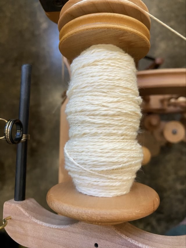 Photo description: three ply Egyptian cotton yarn on a wood bobbin of an Ashford Traveller spinning wheel