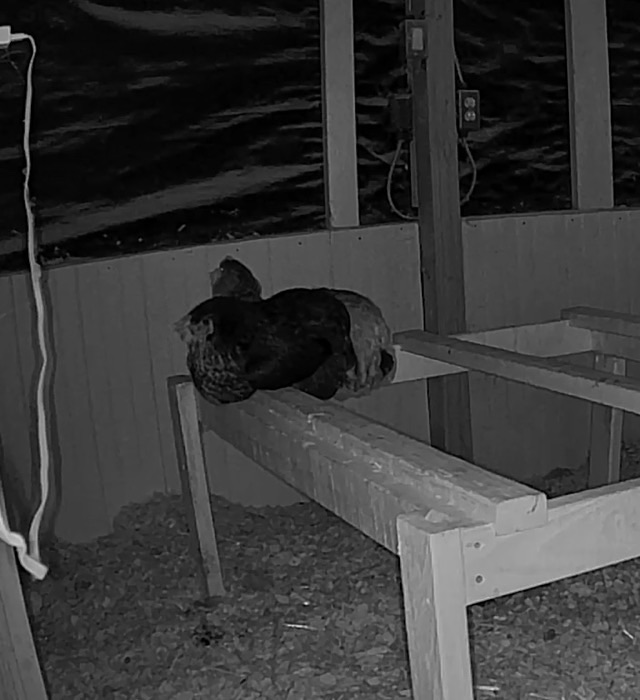 The back corner of the roost in the coop is the prime sleeping position for the chickens. Since Wing Ding the Black Star hen has taken to the roost, it has been her domain and the Faverolles have given her space. I caught them on camera recently snuggling up, though. I’m not sure if Wing Ding let them, or she was asleep when they shuffled over. Positive outcome either way.